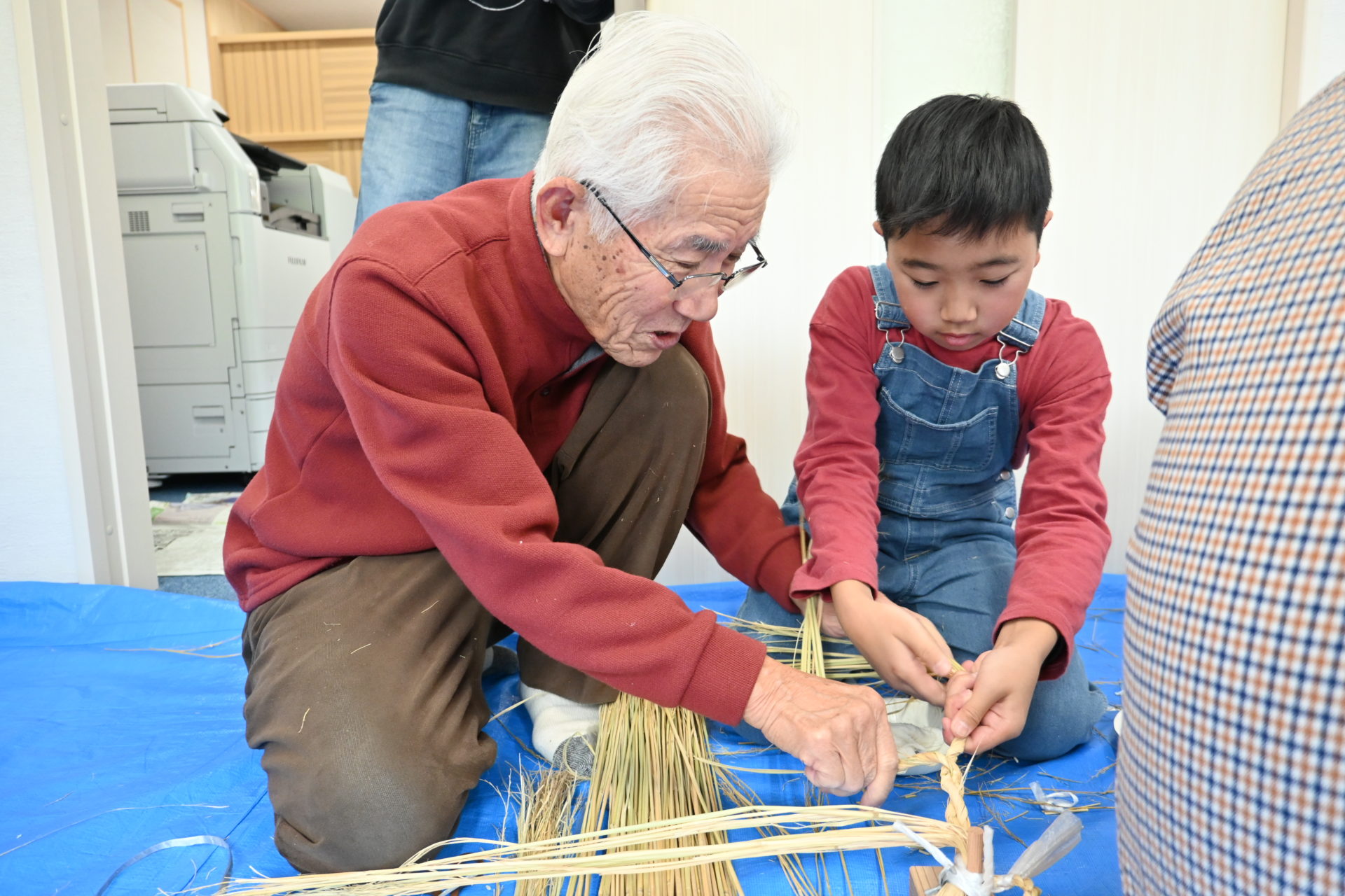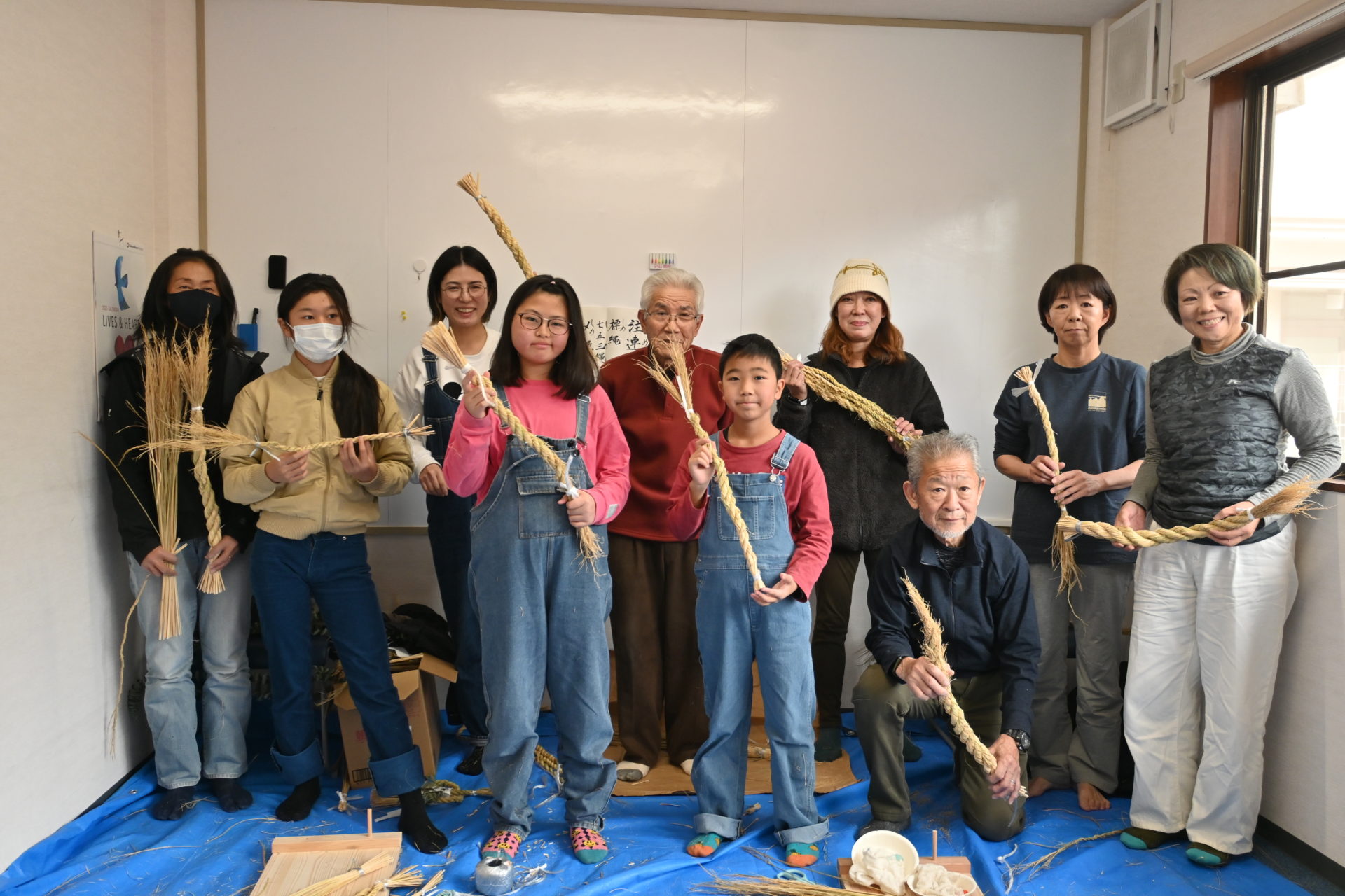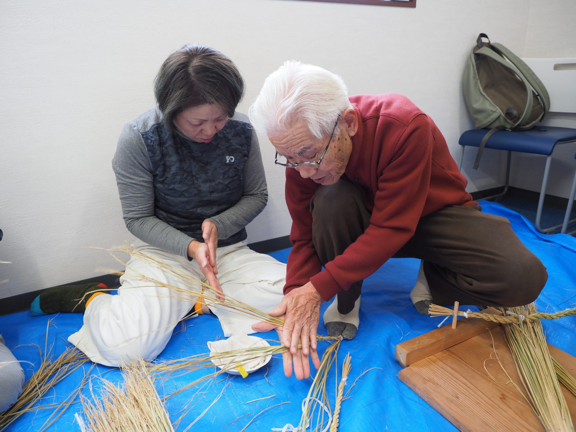 しめ縄の基本は「縄を綯(な)う」こと。一見、手を擦り合わせているだけのように見えるのですが、実際にやってみるとこれが難しい作業。頭で考えるとこんがらがるような作業に苦戦する人も。これができないとしめ縄はできないので、必死にくらいつきます。「子どもが上手にやってくれていたのがよかった」と先生。スタッフも事前に講習を受けたのですが、参加されたみなさんの出来栄えの差に驚きました。