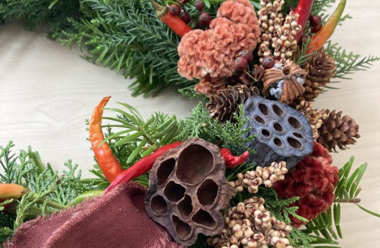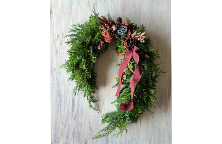 クリスマスにもぴったり、幸運のアイテムである「馬蹄」をイメージしたリースをつくってみませんか。フレッシュなモミ、サツマスギ、川上村産のヒノキに木の実などでクリスマスデコレーションをします。2026年の干支は「うま」なので、馬蹄モチーフとしてクリスマスが過ぎてもお正月飾りとしてもお使いいただけます。サイズは約50cm。左右対称にしたりアシンメトリーにしたりとご自由にお作りいただけます。