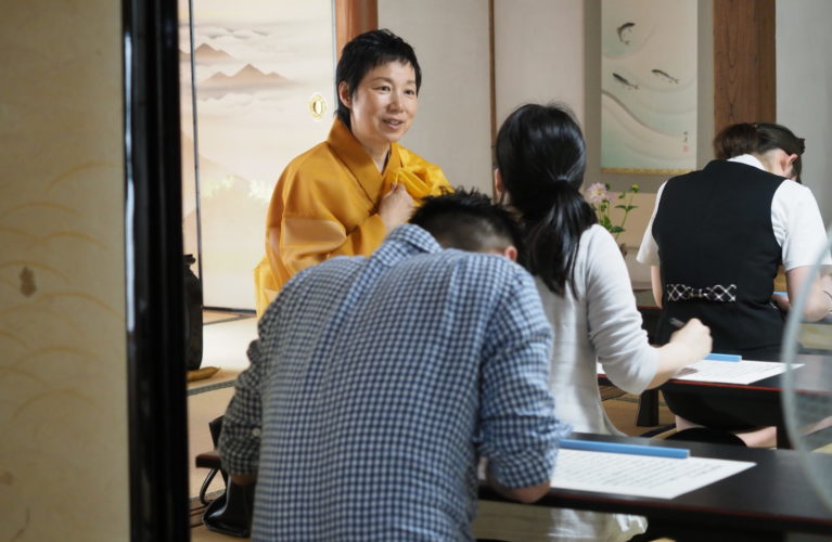 真言宗の厳しい修行を長年続けられている住職のお話を聞き「瞑想」をし、自立神経を整えます。瞑想で心が整ったら「写経」を実践しましょう。