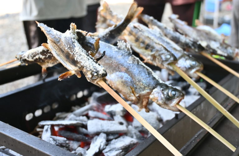 釣った魚はその場で塩焼きに!大自然で食べる新鮮な川の恵みは美味しいこと間違いなし。