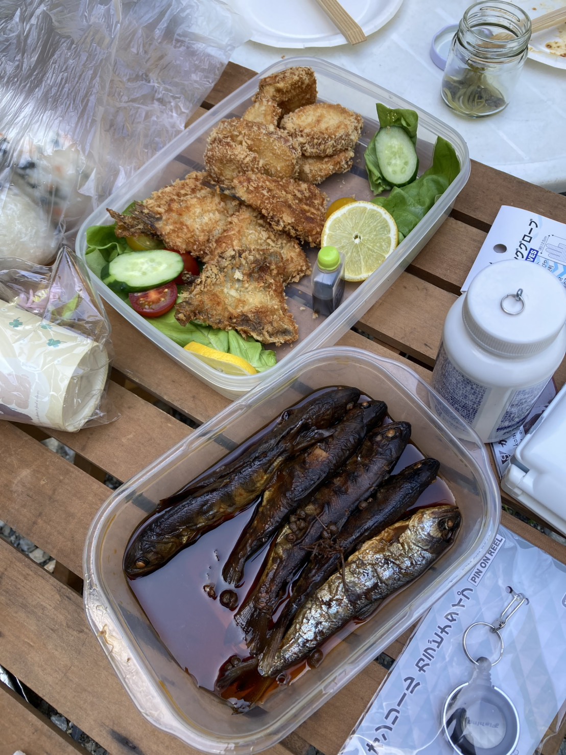 釣りを楽しんだ後は、奈加さんの奥様によるアマゴ料理でひと休み。