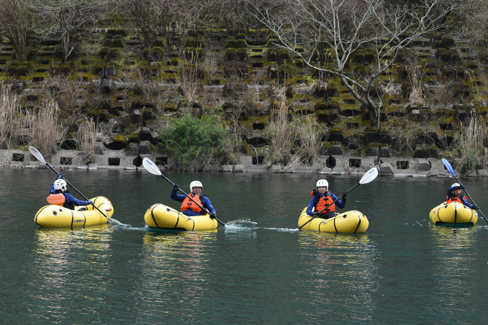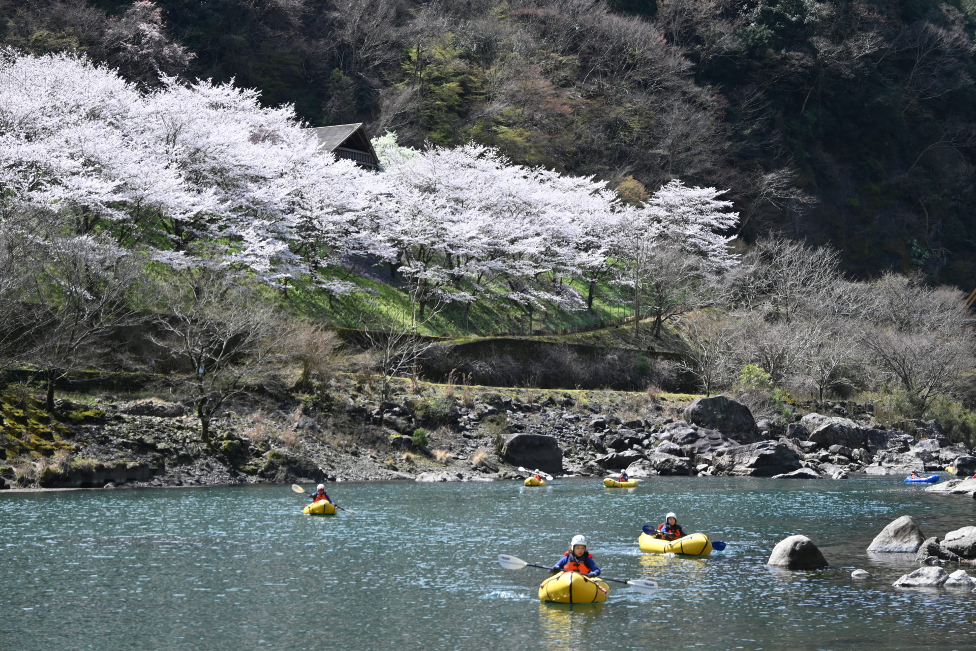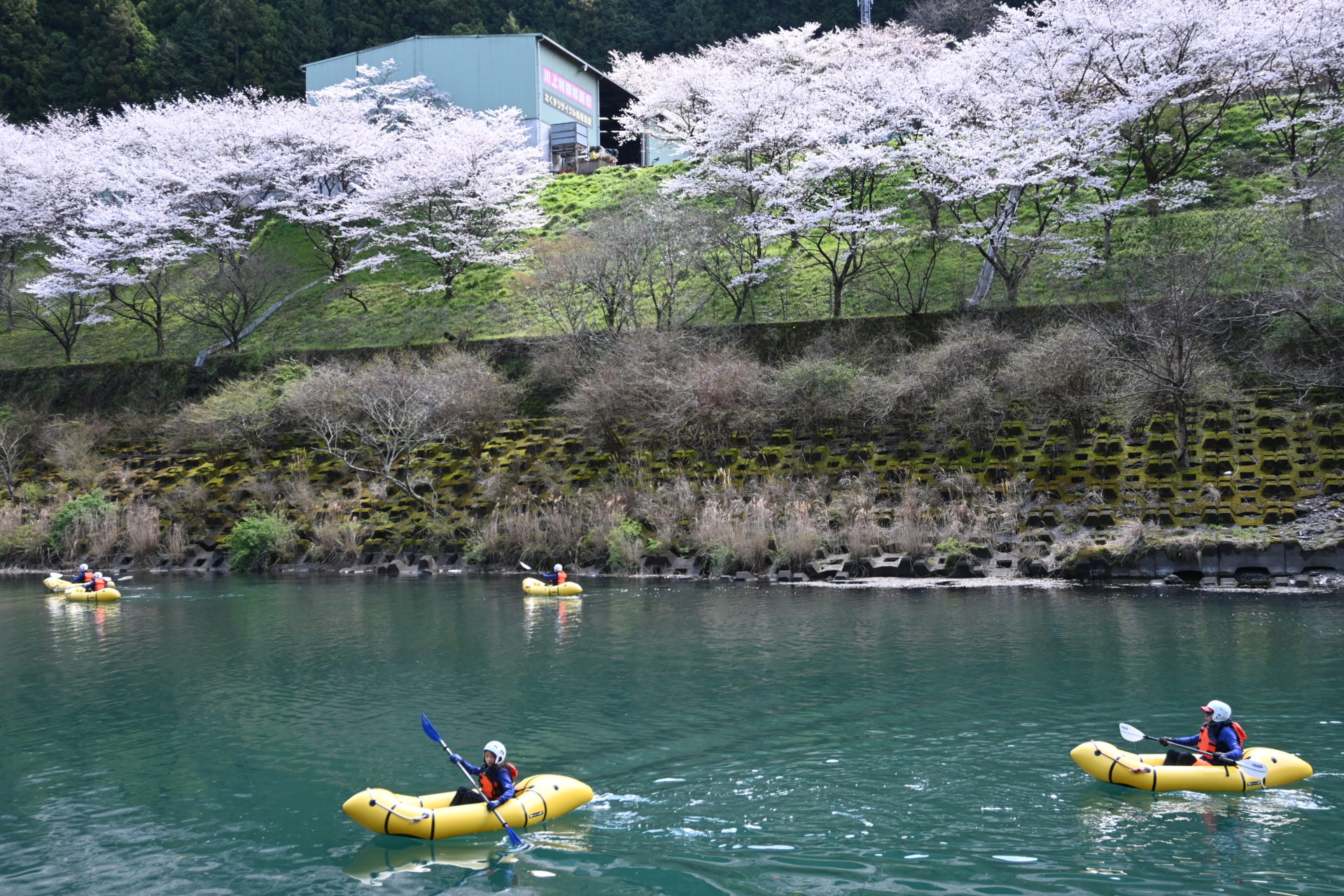 さくら通り下の川面から桜を眺めながらパックラフトを楽しむプログラムです。