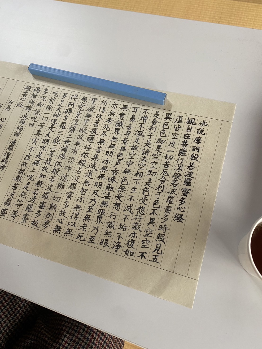 瞑想の仕方など、ていねいに教えて頂き、とても心が落ち着きました。何かに囚われそうになったが流していくという経験も良かったです。写経は、途中から焦ってしまったので、家で早く丁寧に書けるよう練習して、また参加させて頂きたいと思いました。ありがとうございました。(大阪府 50代女性)