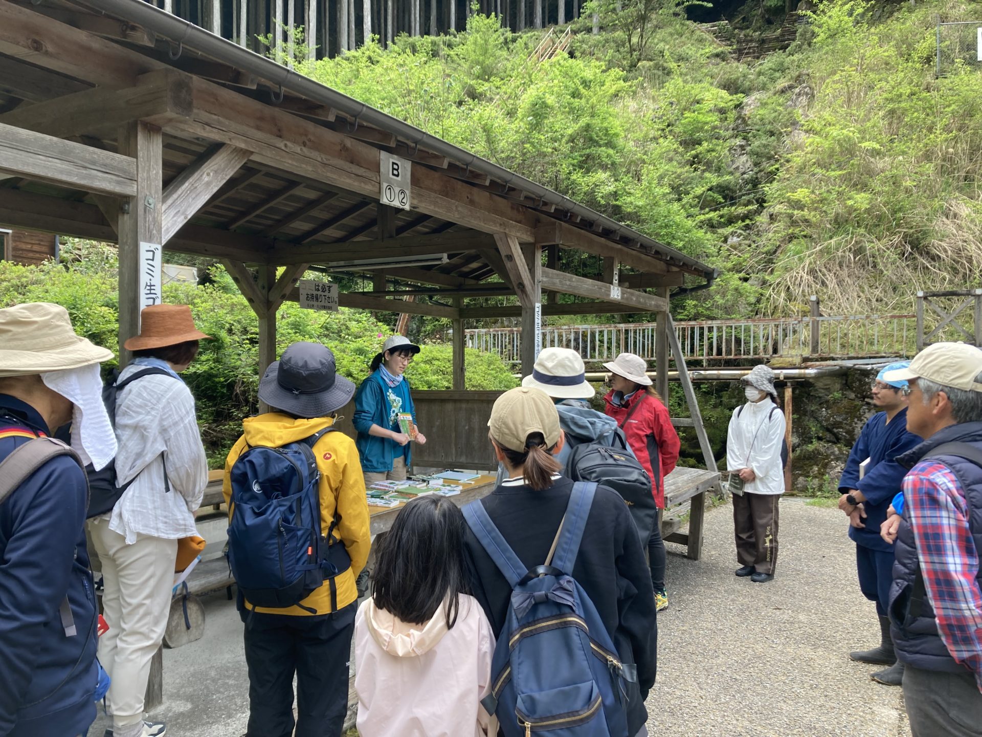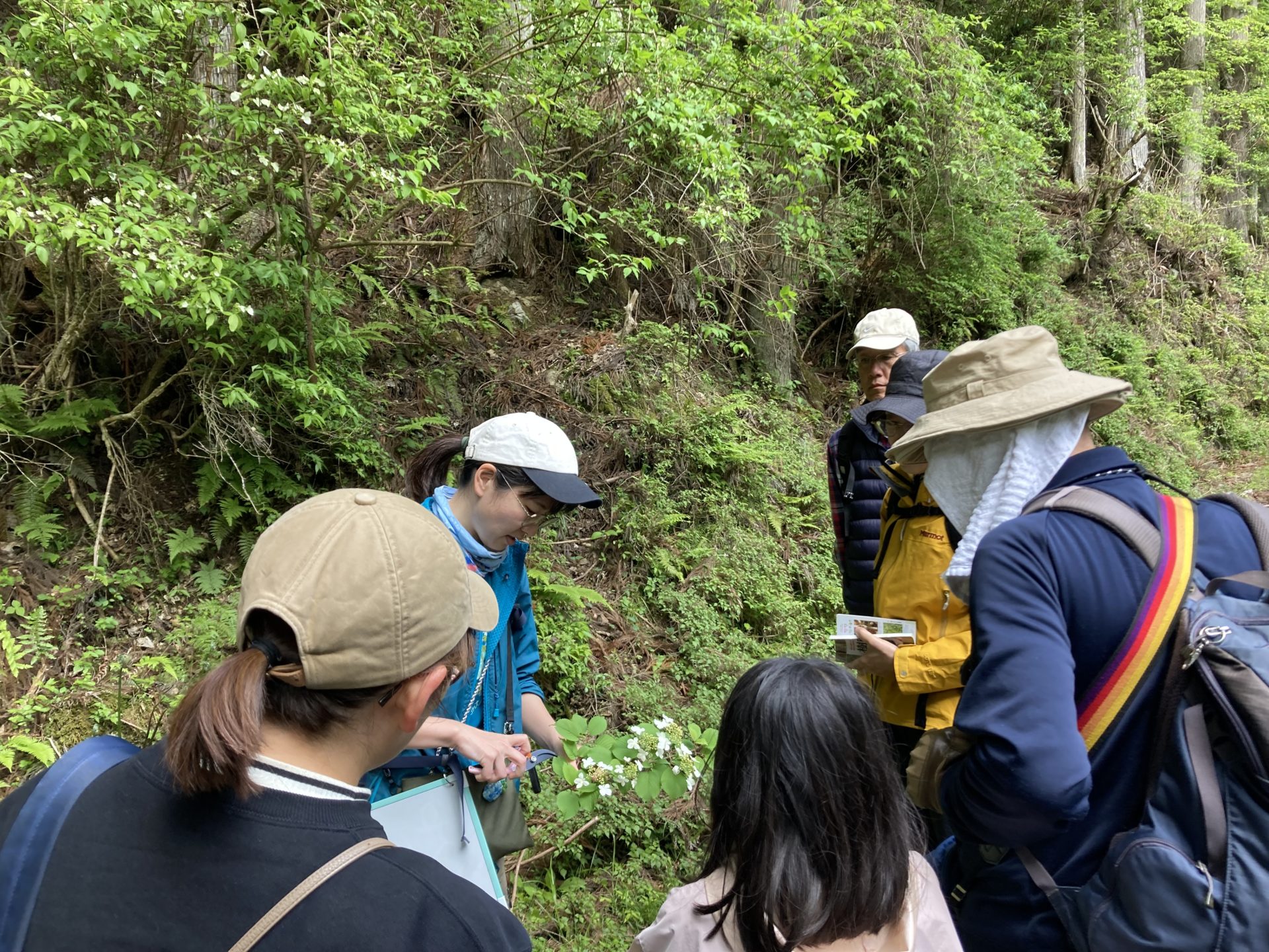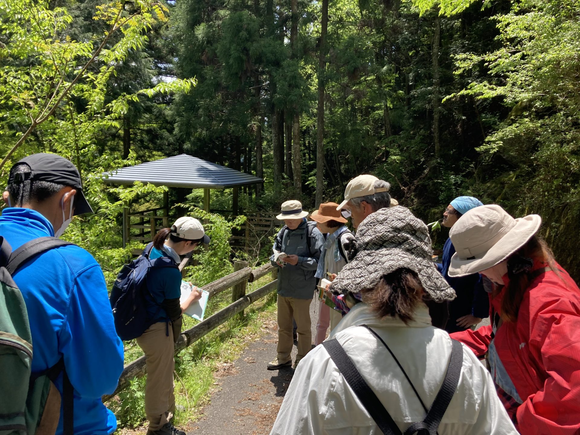 初夏の心地よい風に包まれながら、井氷鹿(いひか)の里から御船の滝までの道のりを歩き、沿道に生えるさまざまな樹木を観察しました。