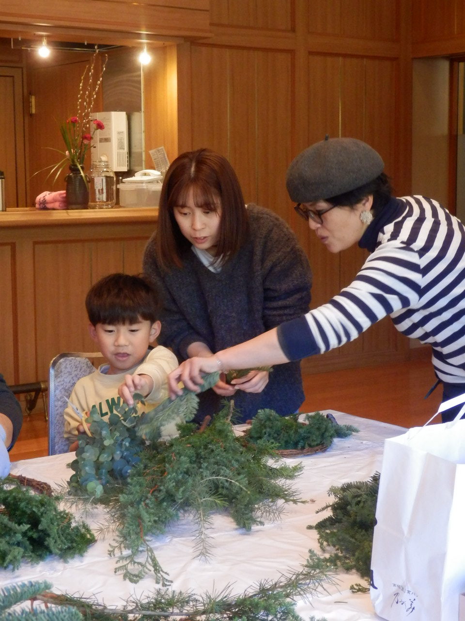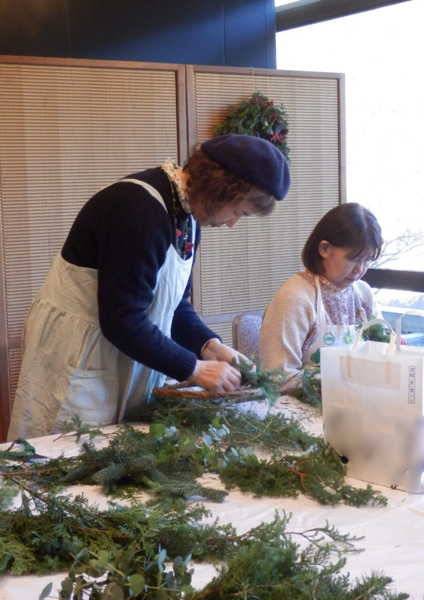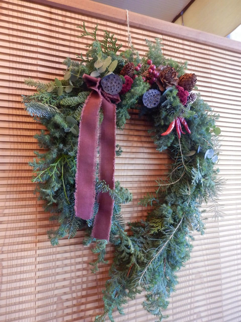 生の枝や色々な種類を準備してくれてあり、軸にまいて行程が難しかったですけど、慣れてくると楽しかったです。すごく良い香りがして、癒された。飾りのまつぼっくりやハス、とうがらしの配置に迷いましたが、それも楽しかったです。 (大和高田市 50代女性)