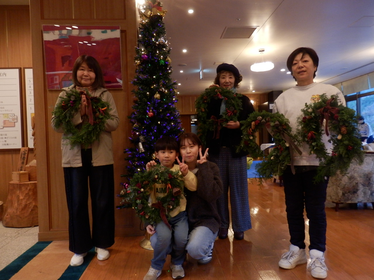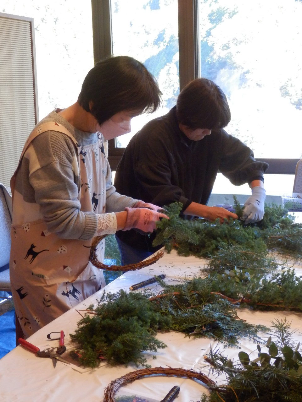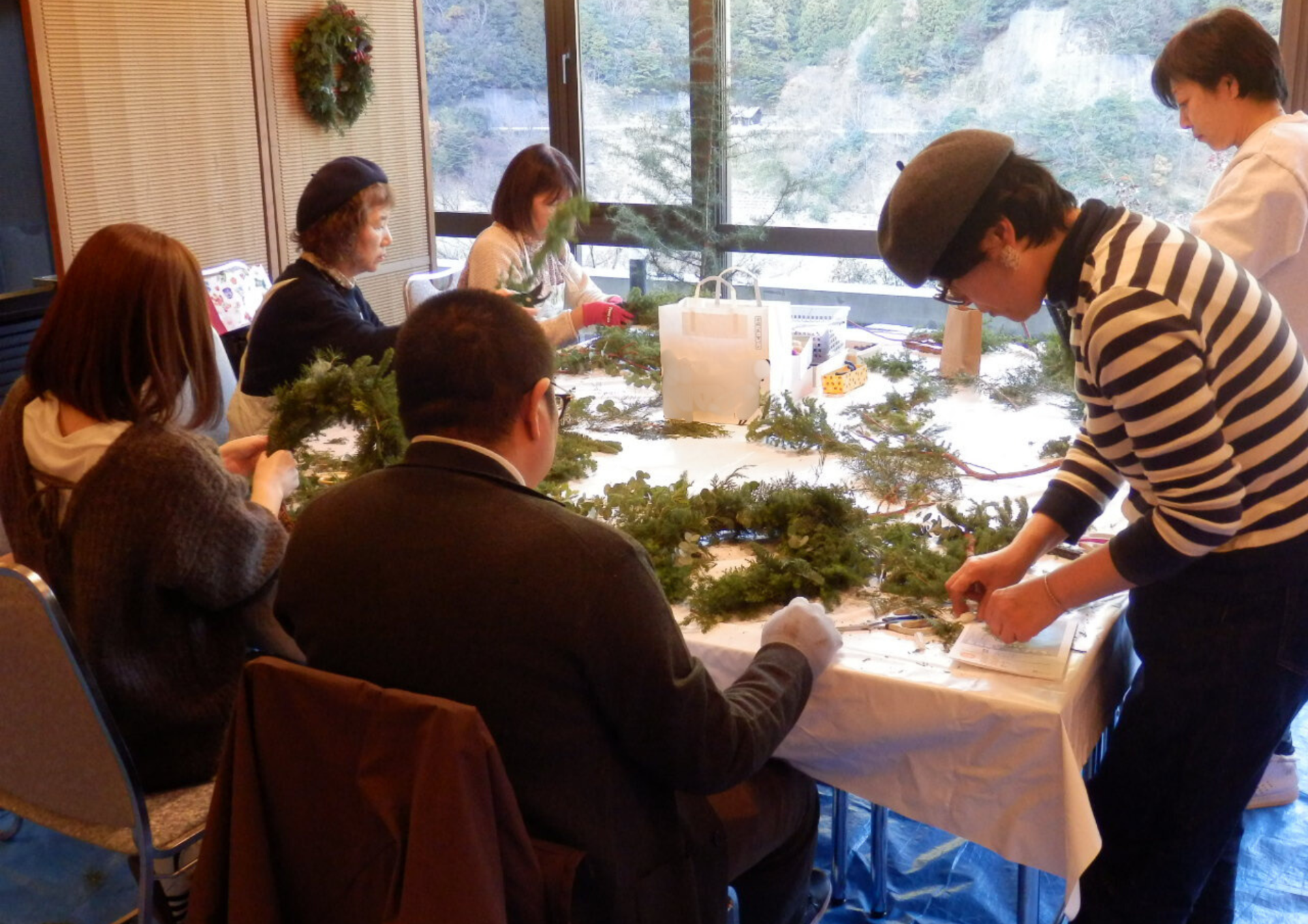 生の枝や色々な種類を準備してくれてあり、軸にまいて行程が難しかったですけど、慣れてくると楽しかったです。すごく良い香りがして、癒された。飾りのまつぼっくりやハス、とうがらしの配置に迷いましたが、それも楽しかったです。 (大和高田市 50代女性)