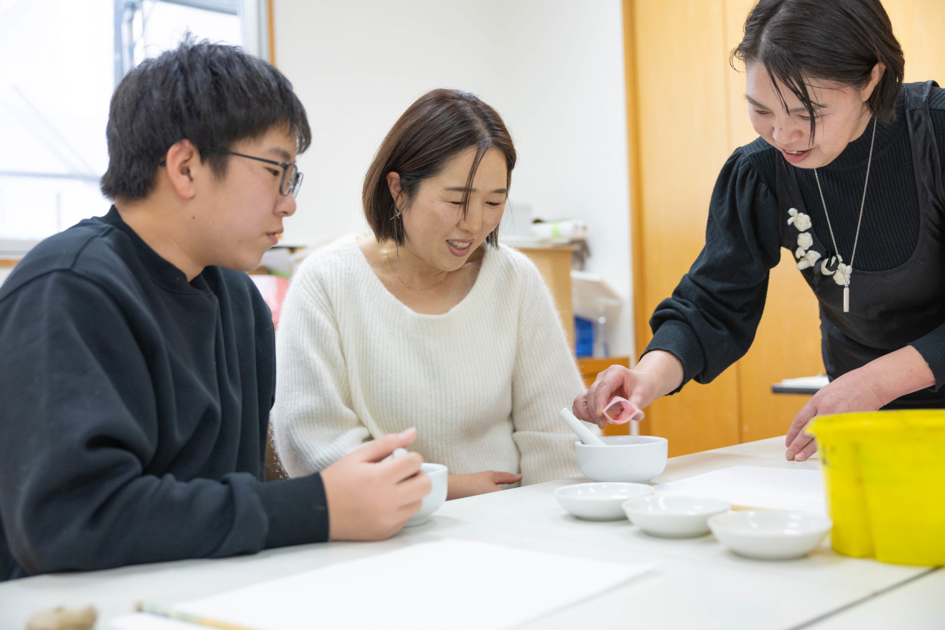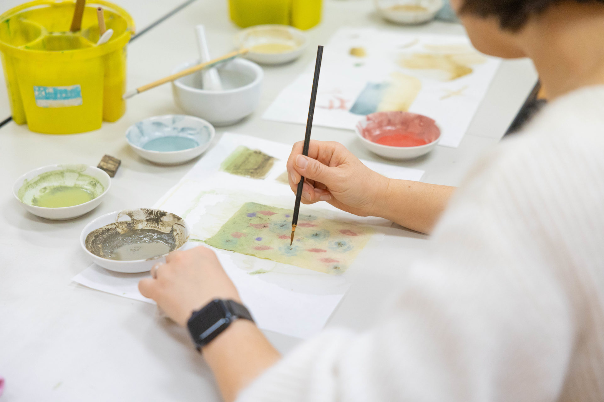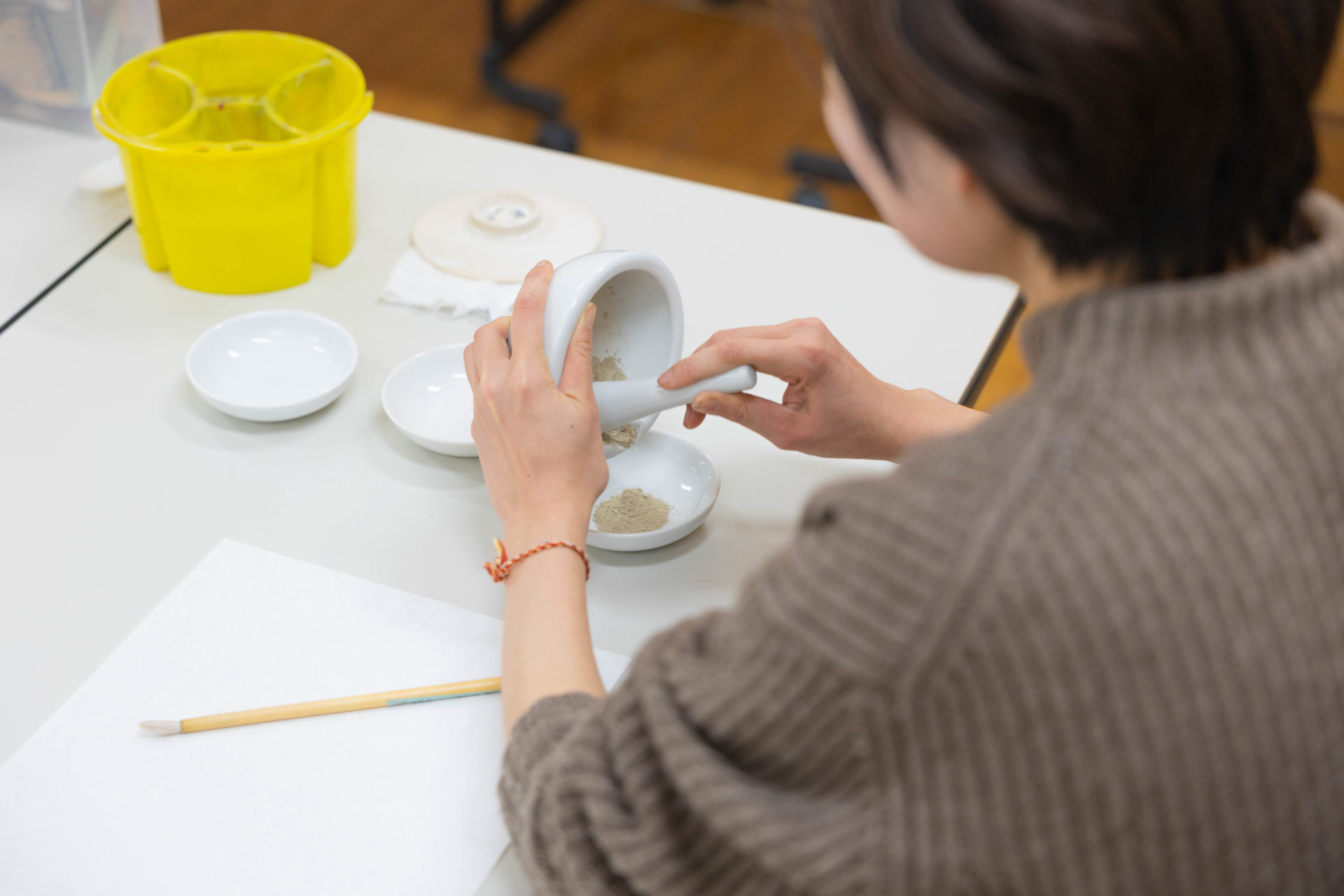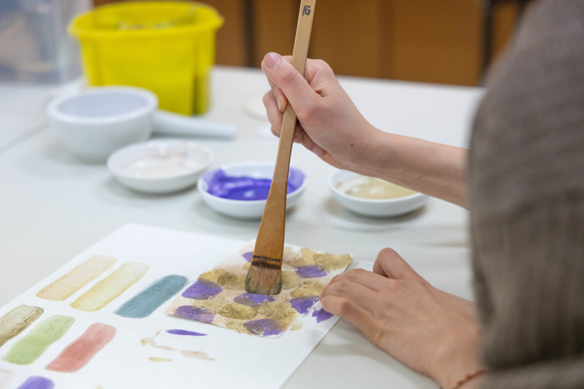 用意されたたくさんの色の岩絵の具を、完成の色を思い描きながら混ぜました。